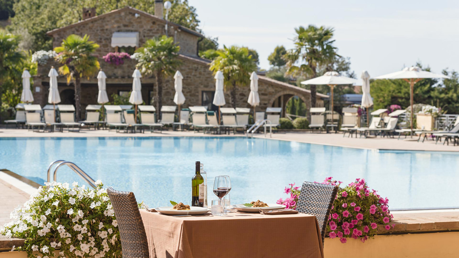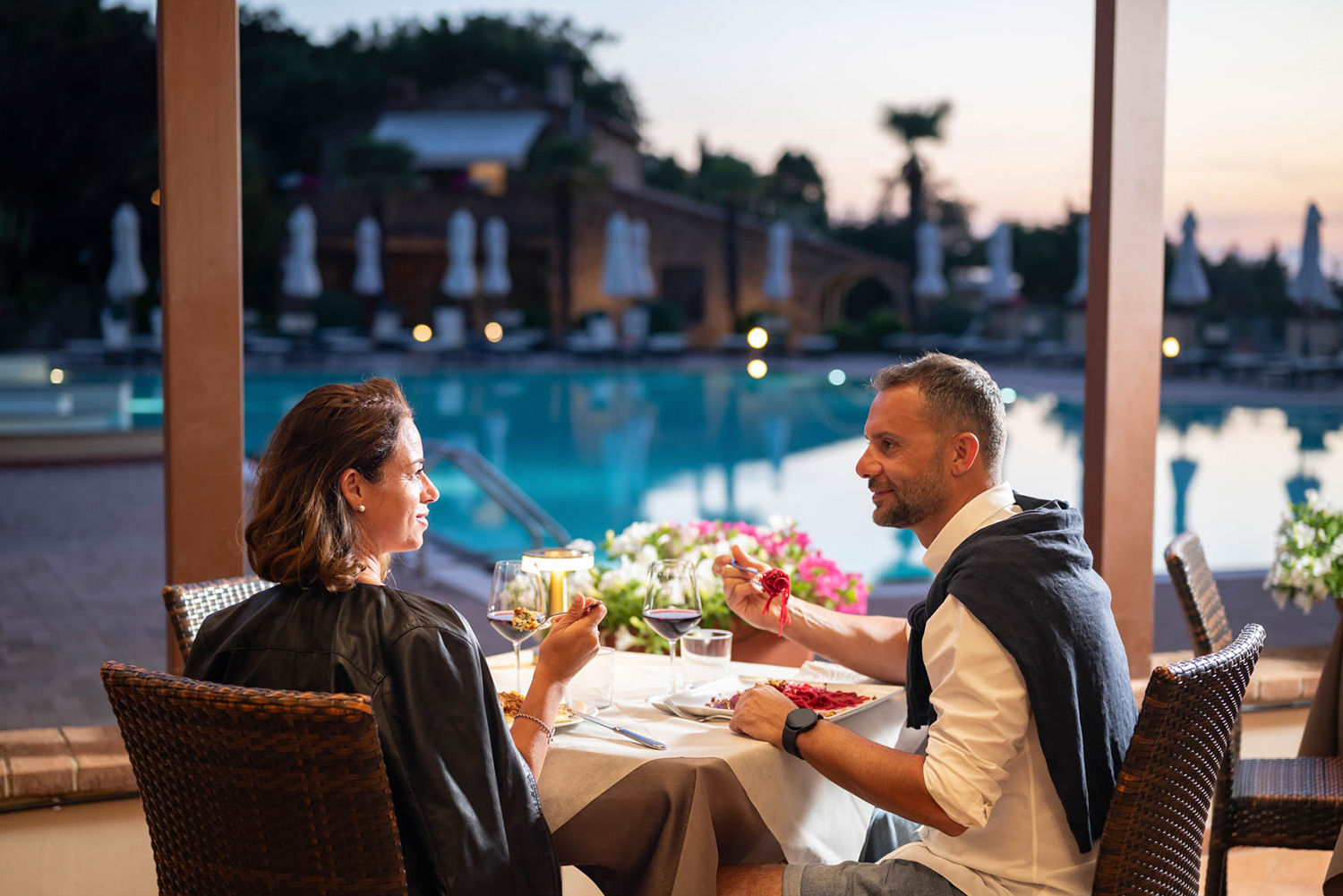 At sunset time, the pool and surrounding landscape become the perfect setting for relaxing aperitifs, refreshing cocktails and moments of conviviality to share.
